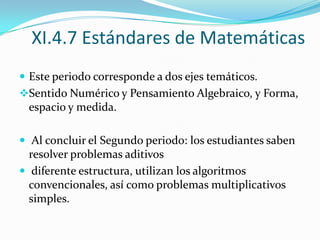 El documento presenta los estándares de matemáticas para el tercer semestre de la asignatura de Matemáticas y su Enseñanza II. Los estándares cubren dos ejes temáticos: Sentido Numérico y Pensamiento Algebraico, y Forma, Espacio y Medida. Los estudiantes aprenderán sobre números y sistemas de numeración, problemas aditivos y multiplicativos, usando algoritmos convencionales y procedimientos informales para resolver problemas de suma, resta, multiplicación y división de números naturales de hasta cuatro cifras.