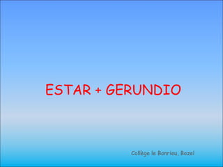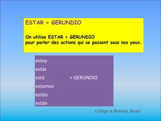 El documento explica cómo usar la construcción "estar + gerundio" en español para hablar de acciones que están ocurriendo en el momento. Explica que se usa "estar" con el gerundio de los verbos para describir lo que está sucediendo ahora, y proporciona ejemplos de cómo formar el gerundio para verbos que terminan en AR, ER e IR agregando ANDO o IENDO al radical del verbo.