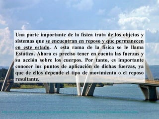 Este documento trata sobre la estática de partículas. Explica que la estática estudia objetos y sistemas en reposo y las fuerzas que actúan sobre ellos. Describe que una fuerza se caracteriza por su magnitud, dirección y punto de aplicación. También cubre conceptos como vectores, suma de vectores, componentes rectangulares de fuerzas, y las condiciones para el equilibrio de una partícula.