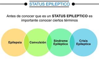 El documento proporciona una visión integral sobre el estatus epiléptico, definiéndolo como crisis convulsivas continuas con alteración de la conciencia, y detalla su epidemiología, fisiopatología, clasificación y diagnóstico. También se abordan tratamientos específicos en diferentes fases de gestión de esta condición, incluyendo la administración de medicamentos y el uso de EEG para evaluación. Además, incluye un caso clínico que ejemplifica la presentación y el manejo del estatus epiléptico en una paciente específica.