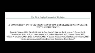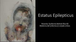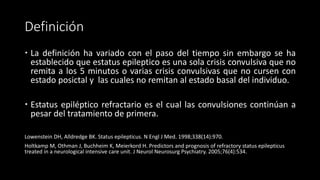 Este documento describe el estatus epiléptico, incluyendo su definición, epidemiología, etiología, clasificación, diagnóstico y tratamiento. Define el estatus epiléptico como una crisis convulsiva que no remite a los 5 minutos o varias crisis que no permiten el retorno al estado normal. Describe el tratamiento de primera línea con benzodiacepinas y de segunda línea con fármacos antiepilépticos. Para casos refractarios recomienda agentes como barbitúricos, propofol o anestésicos inhalados.