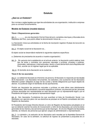 Este documento presenta un modelo de estatuto para una asociación civil sin fines de lucro. Establece las normas y reglas que rigen su funcionamiento. Describe los órganos de gobierno de la asociación, los derechos y obligaciones de los asociados, y las atribuciones del consejo directivo y el director ejecutivo. El objetivo es proveer una guía básica para la organización y gestión de una asociación civil de acuerdo a la ley.