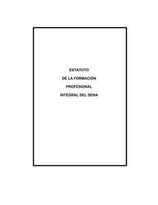 Este documento presenta el Estatuto de la Formación Profesional Integral del Servicio Nacional de Aprendizaje (SENA) de Colombia. El estatuto define la formación profesional integral como un proceso educativo con identidad propia orientado desde y hacia el trabajo productivo. Establece los principios, características y procesos de la formación profesional integral en el SENA, incluyendo la identificación de necesidades de formación, el diseño curricular, la gestión del proceso de formación y la evaluación. El estatuto busca orientar las acciones del S