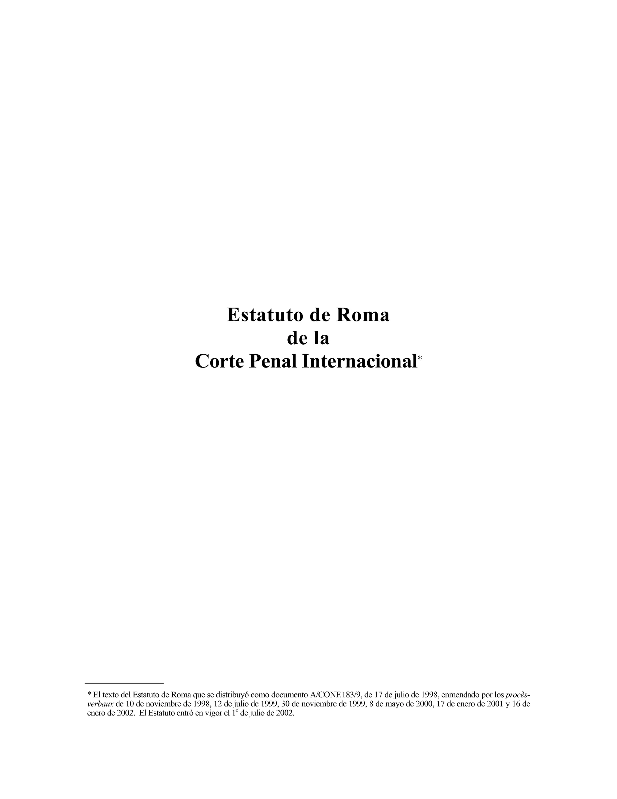El Estatuto de Roma establece la Corte Penal Internacional como un tribunal permanente con competencia sobre los crímenes más graves que afectan a la comunidad internacional, tales como genocidio, crímenes de lesa humanidad, crímenes de guerra y crimen de agresión. La corte complementa las jurisdicciones penales nacionales y busca poner fin a la impunidad de los autores de estos crímenes. El documento define las atribuciones y procedimientos de la corte y su relación con las Naciones Unidas.