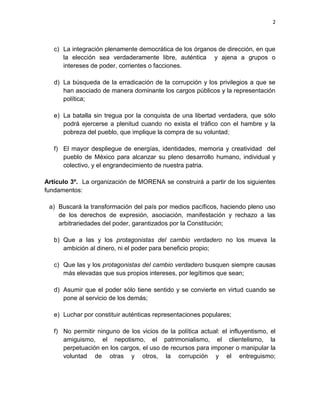 El estatuto de Morena establece los principios, objetivos y estructura organizativa del partido, enfocado en la transformación pacífica y democrática de México, garantizando derechos plenos y erradicando la corrupción. La organización busca promover la participación ciudadana a través de comités locales, defendiendo la libertad y la soberanía del pueblo. Asimismo, se establece un sistema de afiliación y responsabilidad individual para asegurar el compromiso con los ideales de cambio verdadero.