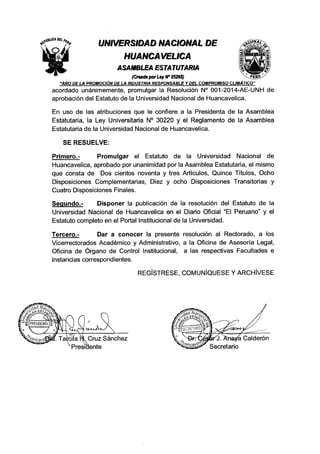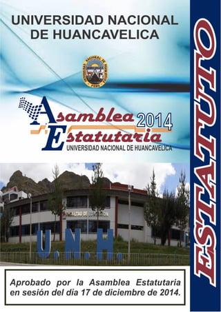 La Universidad Nacional de Huancavelica fue creada en 1990 mediante una ley para brindar educación superior en Huancavelica y otras sedes. El documento presenta el estatuto de la universidad, el cual contiene 14 títulos y más de 50 capítulos que describen su marco legal, principios, fines, estructura organizativa, autoridades, docentes, estudiantes y otros aspectos relacionados a su funcionamiento académico y administrativo.