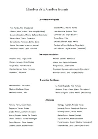 El documento presenta el nuevo Estatuto de la Universidad Nacional José Faustino Sánchez Carrión. El Estatuto fue aprobado por la Asamblea Estatutaria de la universidad y contiene las normas básicas que regirán la institución. El Estatuto consta de diecisiete títulos y cuatrocientos cuarenta y cinco artículos. La Asamblea Estatutaria espera que este instrumento normativo mejore gradualmente la universidad en beneficio de la comunidad universitaria.