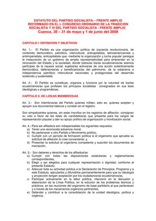 Este documento presenta el Estatuto del Partido Socialista – Frente Amplio de Ecuador, reformado en su 1er Congreso Ordinario de 2008. Define al partido como una organización política de izquierda revolucionaria con objetivos democráticos, anticapitalistas y antiimperialistas. Describe la estructura organizativa del partido, incluyendo sus organismos directivos como el Congreso, Consejo Nacional y Comité Ejecutivo Nacional, y establece las normas para la afiliación y deberes de los miembros.