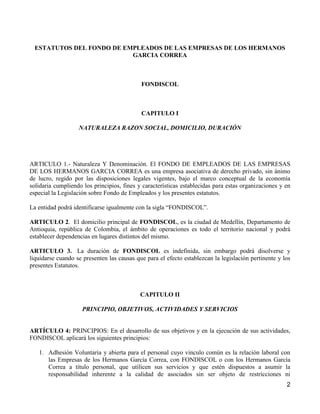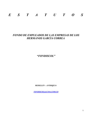 Este documento contiene los estatutos del Fondo de Empleados de las Empresas de los Hermanos García Correa (FONDISCOL). Establece la naturaleza, objetivos, principios y actividades de FONDISCOL, el cual es una empresa asociativa sin ánimo de lucro que brinda servicios de ahorro, crédito y bienestar a sus asociados, que son empleados de las empresas de los Hermanos García Correa. También describe los deberes y derechos de los asociados, así como los procedimientos para ingresar, retir