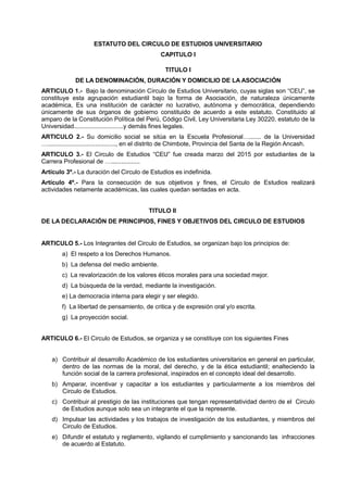 Este documento presenta los estatutos del Círculo de Estudios Universitario, una asociación estudiantil sin fines de lucro. Los estatutos describen la misión, principios, objetivos y estructura de gobierno de la organización. La asociación busca mejorar el rendimiento académico de los estudiantes a través de actividades como grupos de estudio, proyectos de investigación y eventos educativos. La asociación está gobernada por una Asamblea General y un Consejo Directivo compuesto por 7 cargos. Los estat