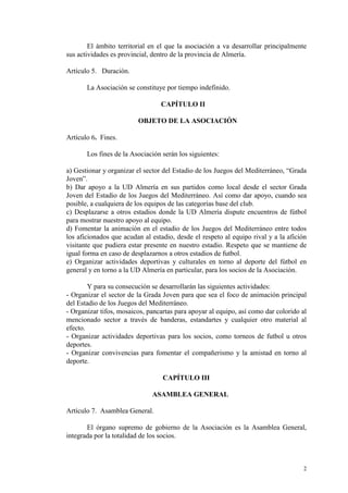 Este documento presenta los estatutos de la Asociación Deportiva "Grada de Animación Almerienista". Establece que la asociación se constituye para apoyar al equipo de fútbol UD Almería y organizar la sección de animación "Grada Joven" en el estadio. También describe los órganos de gobierno de la asociación, incluyendo la Asamblea General, y establece disposiciones sobre convocatorias, quórum, votaciones y otros asuntos relacionados con la gestión de la asociación.