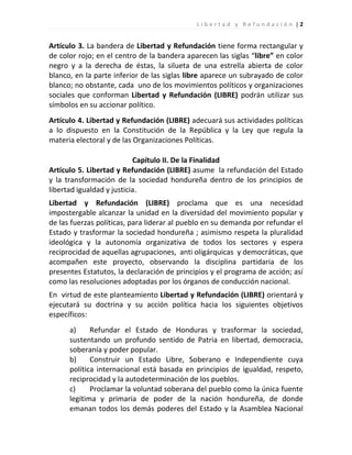Este documento presenta los estatutos del partido político Libertad y Refundación (LIBRE) en Honduras. Establece que LIBRE se formó en 2011 como una fuerza política democrática y revolucionaria. Sus objetivos incluyen refundar el estado hondureño y transformar la sociedad basada en principios de libertad, igualdad y justicia; construir un estado soberano e independiente; y garantizar los derechos humanos. También define los requisitos para la membresía, así como los derechos y deberes de los miembros de LIBRE.