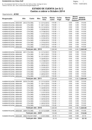 Este documento presenta los estados de cuenta de tres departamentos (A101, A102 y A104) en un condominio. Detalla los montos adeudados por cada propietario por concepto de cuotas mensuales de los últimos años, así como los pagos realizados. El departamento A102 registra la deuda más alta, con un total de S/4,103.10 adeudados, mientras que A101 debe S/330. El departamento A104 tiene una deuda de S/2,860.
