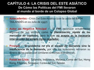 El documento analiza las políticas del FMI durante las crisis económicas en el este asiático en los años 90 y en Rusia. Critica que el FMI promovió una liberalización rápida de los mercados sin considerar la necesaria regulación estatal, lo que empeoró las crisis. También señala que países como Malasia y Corea del Sur tuvieron más éxito al mantener un mayor control estatal y aplicar políticas menos contractivas.