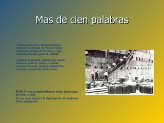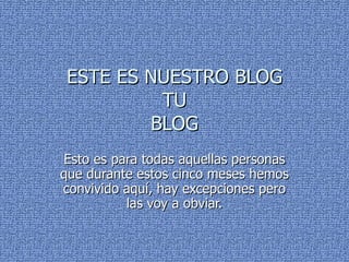 Este documento es una despedida del blog "Tu Blog, Mi Blog" donde el autor ha pasado los últimos cinco meses interactuando con otras personas. A lo largo del texto, el autor enumera las diversas cosas que han experimentado juntos en el blog, como amigos, risas, debates y discusiones. Aunque a veces fue difícil, el autor cree que la experiencia en general ha valido la pena. Finalmente, da las gracias a todos los que han formado parte de la comunidad del blog.