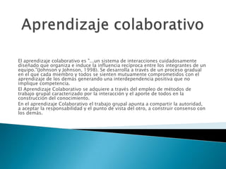 El aprendizaje colaborativo es un sistema de interacciones diseñado para inducir la influencia recíproca entre los miembros de un equipo a través de un proceso gradual que genera una interdependencia positiva y no competitiva. Se adquiere mediante métodos de trabajo grupal que implican interacción y aportes de todos para construir conocimiento compartiendo autoridad, responsabilidad y puntos de vista.