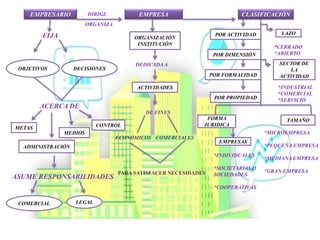 El documento trata sobre la clasificación de empresas según diferentes criterios, como su tamaño, origen de capital y sector económico. Se explican ejemplos de empresas en sectores extractivos, servicios, comerciales, agropecuarios e industriales, así como las categorías de tamaño de microempresas a grandes empresas. También se menciona el concepto de 'famiempresa' como un nuevo tipo de explotación familiar en el ámbito económico.