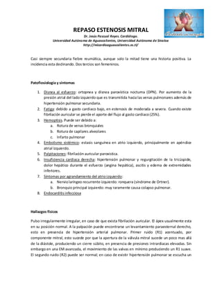 1) La estenosis mitral es generalmente secundaria a fiebre reumática, aunque solo la mitad de los pacientes tienen una historia positiva. Afecta más a mujeres.