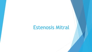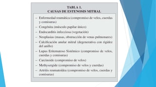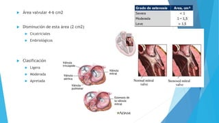 La estenosis mitral causa una alteración hemodinámica que conduce a una sobrecarga sistólica y presiones elevadas. Los síntomas incluyen disnea y edema pulmonar. El diagnóstico se realiza mediante ecocardiograma para medir el área valvular y gradiente transmitral. El tratamiento depende de la gravedad y puede incluir valvuloplastia o sustitución quirúrgica de la válvula mitral.