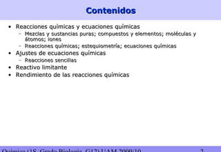 Este documento presenta información sobre estequiometría química. Explica conceptos como mezclas, sustancias, elementos y compuestos. Describe reacciones químicas y cómo se representan mediante ecuaciones químicas, incluyendo la conservación de átomos. También cubre temas como ajustar ecuaciones químicas, reactivos limitantes y rendimiento de reacciones.