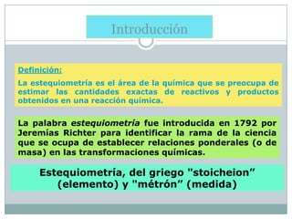 Este documento describe los fundamentos de la estequiometría, incluyendo las leyes de conservación de masa y proporciones definidas. Explica conceptos como mol, masa molar, coeficientes estequiométricos y ecuaciones químicas. También muestra ejemplos de cálculos estequiométricos como conversiones entre moles y gramos.