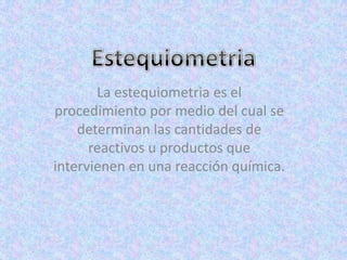 Este documento explica conceptos básicos de estequiometría como la conservación de la matería, el mol como unidad de cantidad de sustancia, la masa atómica como suma de protones y neutrones de un átomo, y la masa molecular como número que indica cuántas veces la masa de una molécula es mayor que la unidad de masa molecular. También define los términos mol, masa atómica, y masa molecular y cómo se calculan.