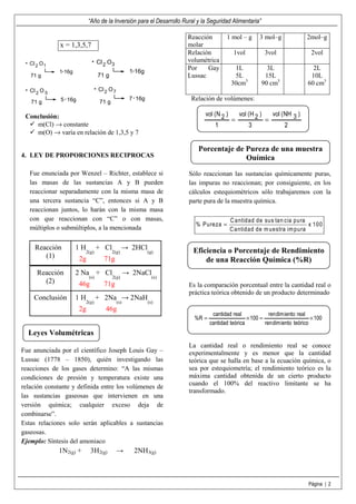 1) La estequiometría estudia las relaciones cuantitativas de masa, volumen y moles entre los reactivos y productos de una reacción química. Estas relaciones se rigen por leyes ponderales y volumétricas.