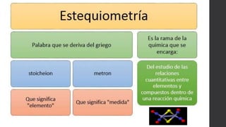 Este documento trata sobre la estequiometría. Explica que la estequiometría estudia las relaciones cuantitativas entre los componentes de una reacción química. Se rige por leyes como la conservación de la masa y las proporciones constantes. También describe cómo se representan las ecuaciones químicas y conceptos como reactivos limitantes, rendimiento teórico y porcentaje de rendimiento.