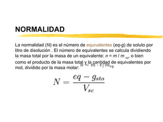 Este documento explica diferentes tipos de concentraciones químicas como molaridad, normalidad y molalidad. Define molaridad como moles de soluto por litro de solución. Normalidad se refiere a equivalentes de soluto por litro, donde los equivalentes dependen si es ácido, base o redox. Molalidad es moles de soluto por kilogramo de disolvente. Incluye ejemplos de cálculos y preguntas de problemas relacionados a estas concentraciones.