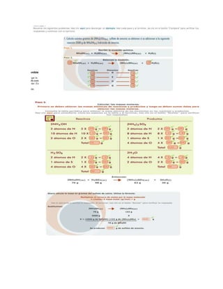 La estequiometria determina las cantidades de reactivos y productos en una reacción química mediante el balanceo de ecuaciones químicas. Se basa en la ley de conservación de la materia y utiliza el mol como unidad para calcular las masas de sustancias usando sus masas atómicas. Los pasos fundamentales para resolver problemas de estequiometria incluyen escribir y balancear la ecuación química y luego calcular las masas de las sustancias.