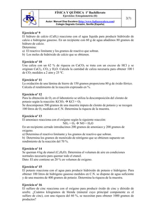Este documento presenta una serie de 16 ejercicios de estequiometría química con sus respectivas respuestas. Los ejercicios involucran cálculos relacionados con reacciones químicas, incluyendo la determinación de reactivos limitantes, masas de reactivos y productos, y volúmenes de gases. El documento fue escrito por Manuel Díaz Escalera y está destinado a estudiantes de primer año de bachillerato.