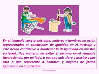Este documento trata sobre los estereotipos de género y la necesidad de un lenguaje inclusivo. En primer lugar, explica que los estereotipos son construcciones mentales que ofrecen una visión simplificada y esquemática del mundo social. Luego, propone que debemos fomentar el uso de un lenguaje no sexista para lograr la igualdad real entre mujeres y hombres. Finalmente, enfatiza que el lenguaje es una herramienta para transmitir la cultura y que debemos asegurarnos de que las mujeres y lo femenino