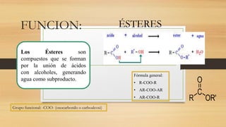 Los ésteres son compuestos formados por la unión de ácidos y alcoholes, generando agua. Se encuentran en productos naturales y se usan en perfumes, saborizantes y grasas. Pueden obtenerse por esterificación o usando anhídridos con alcoholes. Sus usos incluyen esencias, solventes, jabones y fibras como el rayón.