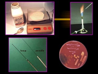El documento describe las técnicas específicas requeridas para trabajar en un laboratorio de microbiología, incluyendo el uso de condiciones asépticas, campanas de flujo laminar y esterilización de materiales e instrumentos. Explica métodos como el calor seco, calor húmedo, vapor saturado a presión y filtración para esterilizar diferentes materiales, y destaca la importancia de prevenir contaminaciones durante el trabajo con microorganismos.
