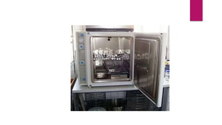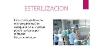 Este documento describe varios métodos de esterilización, incluyendo métodos físicos como el calor seco, el calor húmedo, la radiación y la filtración, así como métodos químicos como el óxido de etileno, el glutaraldehído, el peróxido de hidrógeno y el formaldehído. Los métodos de esterilización actúan alterando el ADN, proteínas, enzimas o membranas celulares de los microorganismos. El método aplicado depende de factores como