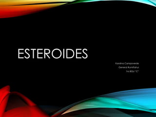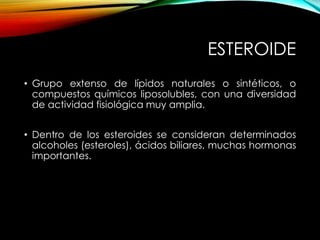 Los esteroides son un grupo diverso de compuestos químicos liposolubles que incluyen hormonas, como el colesterol y las hormonas sexuales. Cumplen funciones reguladoras, estructurales y hormonales en el cuerpo. Las hormonas esteroides se sintetizan a partir del colesterol y actúan uniéndose a receptores celulares para modular la expresión génica. Los esteroides anabólicos son versiones sintéticas de las hormonas masculinas que promueven el crecimiento muscular pero también tienen graves