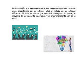 El documento habla sobre la innovación y el emprendimiento. Define la innovación como un proceso de cambio que puede mejorar un producto, proceso o servicio existente o crear uno nuevo. También define la creatividad y explica que aunque es abundante, no necesariamente conduce a la innovación. Luego describe la innovación social y el tipo de emprendedores a los que apunta, enfocados en resolver problemas sociales con propósito. Finalmente, define el emprendimiento y sus características clave como la disposición al riesgo, la perseverancia y la flexibilidad.