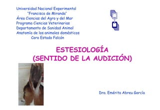 El documento describe la anatomía y función del sentido de la audición en los caprinos. Explica que el sistema auditivo está compuesto por el oído externo, medio e interno. El oído externo incluye la oreja, el meato acústico externo y los músculos auriculares. El oído medio contiene los huesecillos del oído y la trompa de Eustaquio. El oído interno aloja la cóclea, que detecta los sonidos, y el vestíbulo, que mantiene el equilibrio