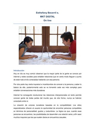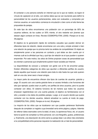 El documento describe cómo las personas usan sitios de citas en línea para conocer parejas potenciales. Explica que estos sitios ofrecen perfiles de usuario, test de personalidad y herramientas para poner en contacto a usuarios compatibles. También cubre los diferentes tipos de cuentas (gratuitas y de pago) y cómo los sitios buscan generar relaciones duraderas basadas en la compatibilidad entre los usuarios.