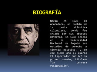 Gabriel García Márquez nació en Colombia en 1927 y publicó su primer cuento a los 20 años. Estudió derecho y ciencia política en la universidad. Es conocido por sus novelas como Cien años de soledad que mezclan magia realismo con elementos históricos y biográficos.