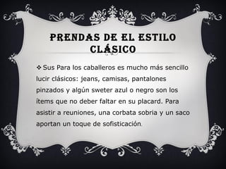 El documento describe el estilo de vida clásico, que se caracteriza por ser maduro, elegante y tradicional. Recomienda prendas básicas como jeans, camisas, pantalones y suéteres en colores neutros para los caballeros, y vestidos, faldas y blazers complementados con camisetas blancas y negras para las damas. Aconseja evitar estampados y optar por detalles discretos como chalinas o corbatas.