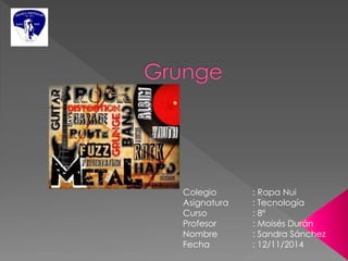 Este documento resume un trabajo escolar sobre el género musical Grunge. Explica que el Grunge surgió en Seattle en los años 90 como una fusión del punk y el heavy metal, con bandas influyentes como Nirvana, Soundgarden y Pearl Jam. El autor opina que el estilo Grunge es diferente y más profundo que la música convencional, y que espera que surjan nuevas bandas para mantener vivo el movimiento.