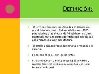 Este documento define el estilo minimalista como aquel que reduce los elementos a lo esencial, eliminando lo superfluo. Las características del minimalismo incluyen la abstracción, economía de recursos, uso literal de materiales, ausencia de ornamentos y énfasis en la funcionalidad y simplicidad. Los muebles minimalistas tienen una estructura simple de pocas líneas y colores neutros. La decoración minimalista utiliza materiales naturales como madera y piedra, así como telas lisas y pocos muebles funcionales.
