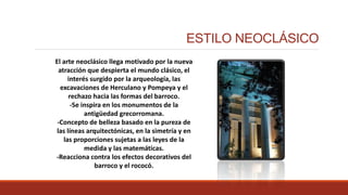 El documento describe los estilos arquitectónicos neoclásico, neogótico y exótico. Resume las características principales de cada estilo, como las columnas, frontones y cúpulas del neoclásico; los arcos apuntados, vidrieras y contrafuertes del neogótico; y las decoraciones exóticas y cúpulas bulbosas del estilo exótico. También incluye ejemplos de edificios representativos de cada estilo con imágenes ilustrativas.
