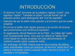 Este documento describe el estilo de crol en natación. Explica que el crol se basa en una acción alternativa de brazos y piernas para propulsarse a través del agua. También describe la técnica correcta del crol, incluida la posición del cuerpo, la acción de brazos y piernas, y la respiración. El documento analiza los errores comunes que deben evitarse para nadar de forma efectiva usando el estilo de crol.