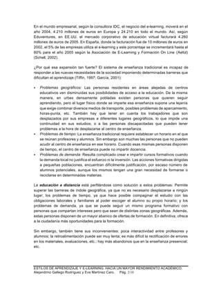 Este documento explora cómo el uso de los estilos de aprendizaje en la enseñanza virtual (e-learning) puede conducir a un mayor rendimiento académico. Explica que el e-learning está creciendo rápidamente debido a que resuelve problemas de la enseñanza tradicional como los geográficos, de tiempo y de demanda. Sin embargo, advierte que el e-learning no garantiza por sí solo una mejor calidad o aprendizaje, pero que herramientas como los estilos de aprendizaje, que son difíciles de aplicar en el