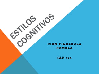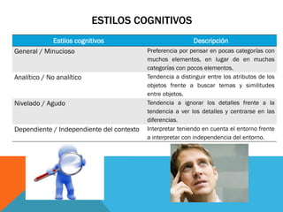 El documento describe diferentes estilos cognitivos, incluyendo si las personas prefieren pensar en categorías amplias o detalladas, si analizan atributos o buscan similitudes, y si ignoran detalles o se enfocan en ellos. También describe si las personas interpretan independientemente del contexto o lo toman en cuenta, y si responden rápido o deliberan. Explica preferencias por tareas simples o complejas, pensamiento lógico o asociativo, incremental o holístico, e innovador o basado en procedimientos. Finalmente, concluye que es