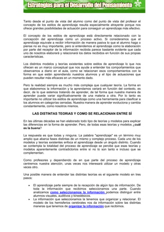 Este documento describe los estilos de aprendizaje y las teorías relacionadas. Explica que los estilos de aprendizaje se refieren a las preferencias individuales en la forma de aprender y procesar información. Discute varias teorías como los sistemas de representación visual, auditivo y kinestésico, la rueda del aprendizaje de Kolb, y las inteligencias múltiples de Gardner. También cubre temas como las estrategias de aprendizaje, la inteligencia emocional y cómo los estilos de aprendizaje influyen en