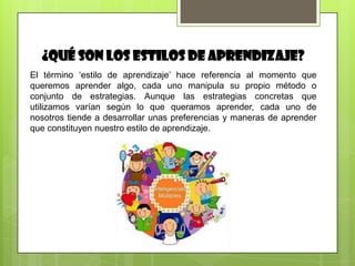 El documento habla sobre los diferentes estilos de aprendizaje: visual, auditivo y kinestésico. Los estilos de aprendizaje se refieren a las preferencias y estrategias que cada persona usa para aprender. Las personas visuales aprenden mejor viendo imágenes y diagramas, los auditivos aprenden escuchando explicaciones, y los kinestésicos aprenden mejor haciendo actividades prácticas que involucren movimiento.