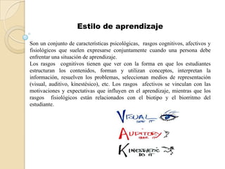 El documento describe tres estilos de aprendizaje: auditivo, visual y kinestésico. El estilo auditivo se caracteriza por aprender mejor a través de la escucha y explicación oral. El estilo visual se basa en el uso de organizadores gráficos como mapas conceptuales. El estilo kinestésico asocia la información con sensaciones y movimientos corporales. Para cada estilo, se proporcionan estrategias para mejorar el aprendizaje.